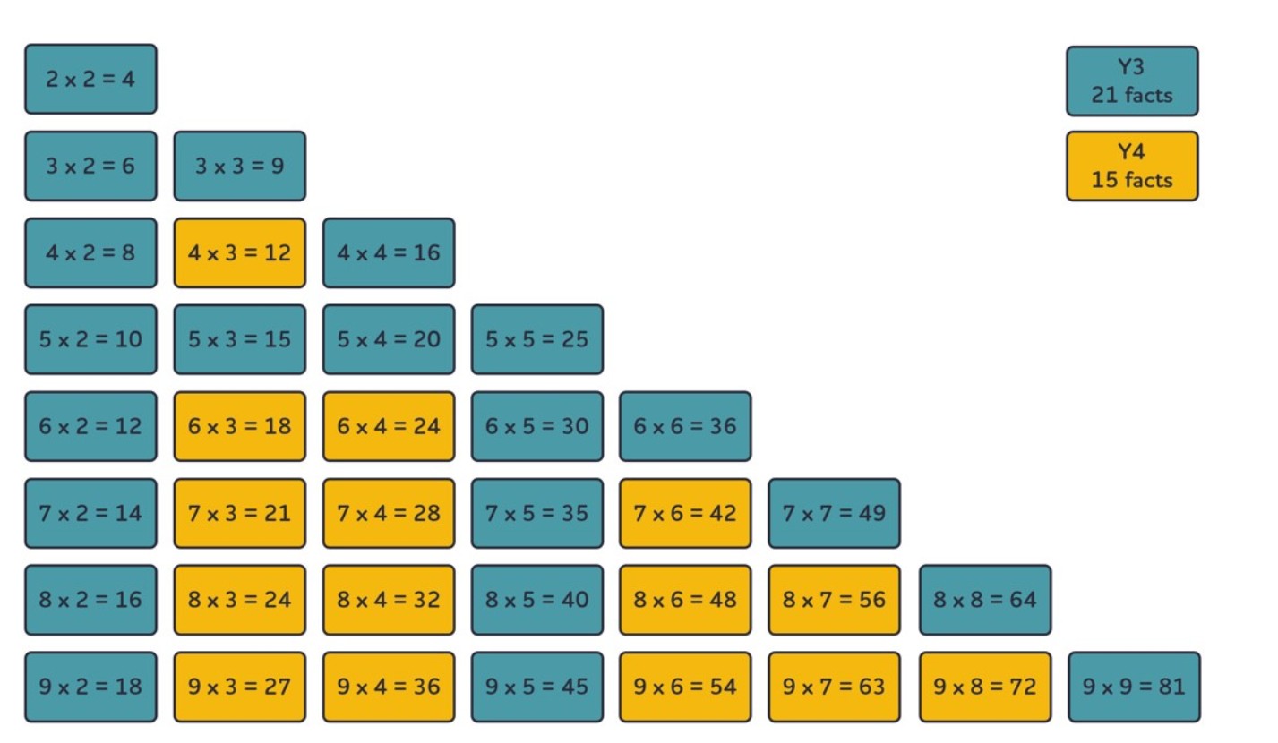 The programme develops recall of 36 core multiplication facts. Fluency in these facts provides the foundation for all written and mental multiplication and division. New facts are introduced and taught visually through the conceptual lessons, and aurally through the chanting of verbal sound patterns. Facts are learned to fluency through daily practice sessions with scores tracked daily and targeted support provided where needed.